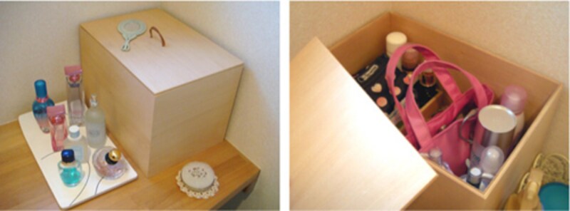 仕事をもっている女性にとっては、洗顔からメイクまでひとつの場所でできれば、忙しい朝の時間が有効に使えます。そこで、窓から差し込む陽の光を感じながら、気持ちよくメイクができるコーナーをつくりました。このときに気を使いたいのはメイクボックス選び。ちょっぴり大きいサイズにすれば、通勤バッグから出したメイク用ポーチもしまえます。さらに、毎日使うものだから素材感も大切。ナチュラルな木肌から伝わるメッセージは、素肌にやさしいナチュラルメイクといったところでしょうか。