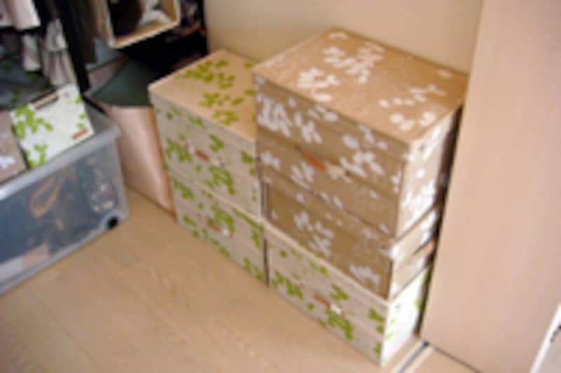| 紙製の衣装ケースも軽いけれど、出し入れを繰り返すうちに変形したり傷みやすい。左:無印良品のソフトボックス |