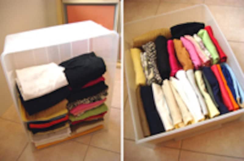 さらに、しまうときにもコツがあります。できればたくさんしまいたいと思っている人が多いはず。そんなときにはケースを縦に置いてから、たたんだ服を次々と積み重ねていきます(画像の左)。すると、服の重みで自然と数多くの服が収まることに。これなら、引き出しごと入れ替えても立てて収納されているので、選びやすいはずです。