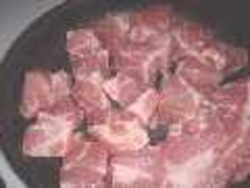 お肉を7cm角程度の大きいさいの目に切り分け、フライパン(油は敷かない)で各面に焼き色をつけます。(煮崩れを防ぎます)