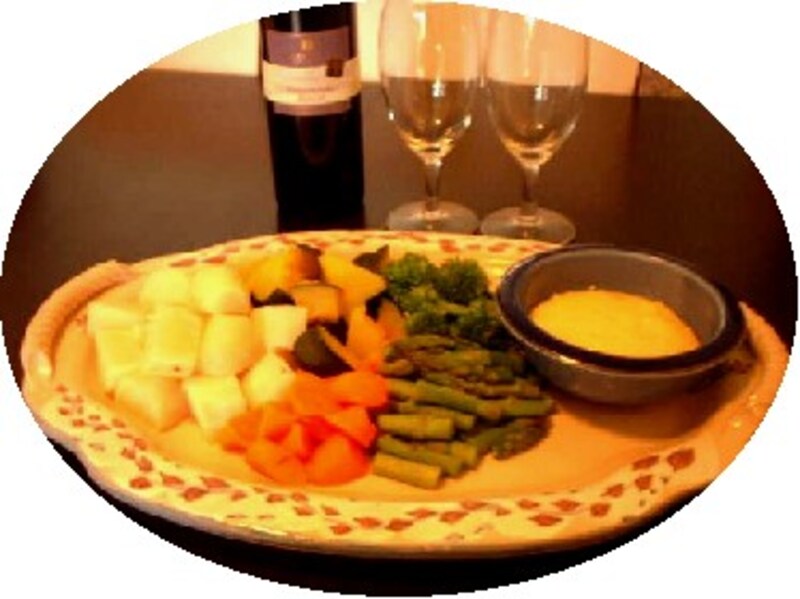あらかじめゆでておいた野菜を大皿にどさっと盛り付け、チーズソースを各々