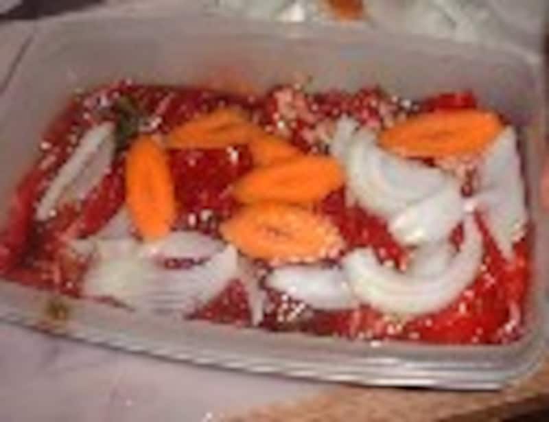 野菜はそれぞれ薄切りにします。お肉を1枚ずつ漬けだれにくぐらせ、タッパーに敷いてゆきます。一面敷き終わったら、その上に野菜を。そしてまたお肉を重ねてゆきます。お肉・野菜・お肉というように、層状にします。