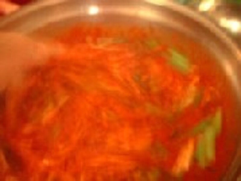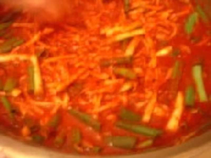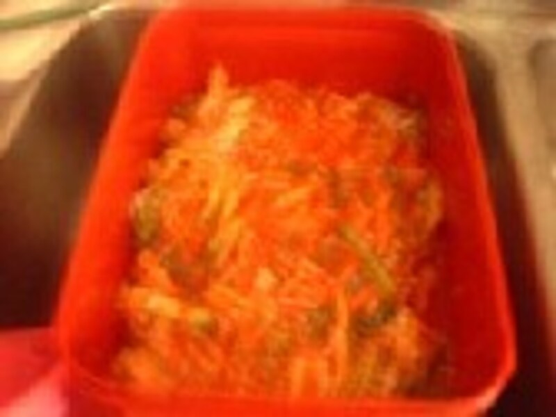 大根は細い短冊切りにし、塩1つかみと粗挽き唐辛子1カップをまぶしておきます。