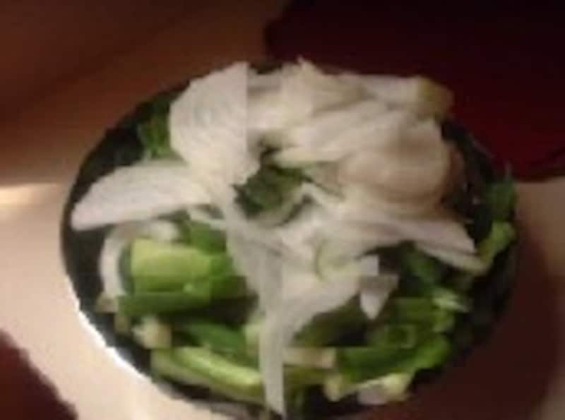 玉ねぎは半切にして薄切り、わけぎは4~5cmに切り分けます。