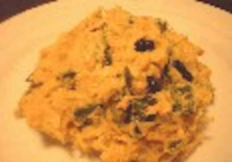 水気を良く飛ばしたかぼちゃをよくつぶし、マヨネーズ・サワークリーム・塩コショウ適宜(お好みでレーズンとアーモンドスライス)でよく合えて、できあがりです。