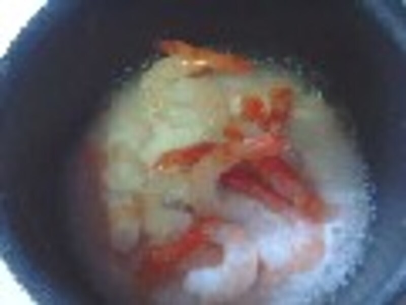 お米ともち米を合わせてとぎ、ざるに30分ぐらい上げた後、分量より少し多めの水(2割増しぐらい)でご飯を炊きます。