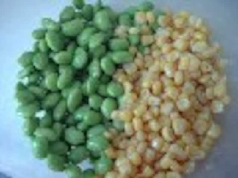 枝豆は、普通食べるようにゆで塩をしておきます。そして皮をむいておきます。