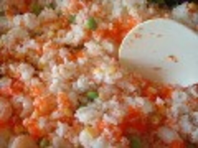 【具材】 甘エビ(20尾)、枝豆(皮なし100g)、コーン(缶:100g)、とびこ(40g)、卵(1コ)