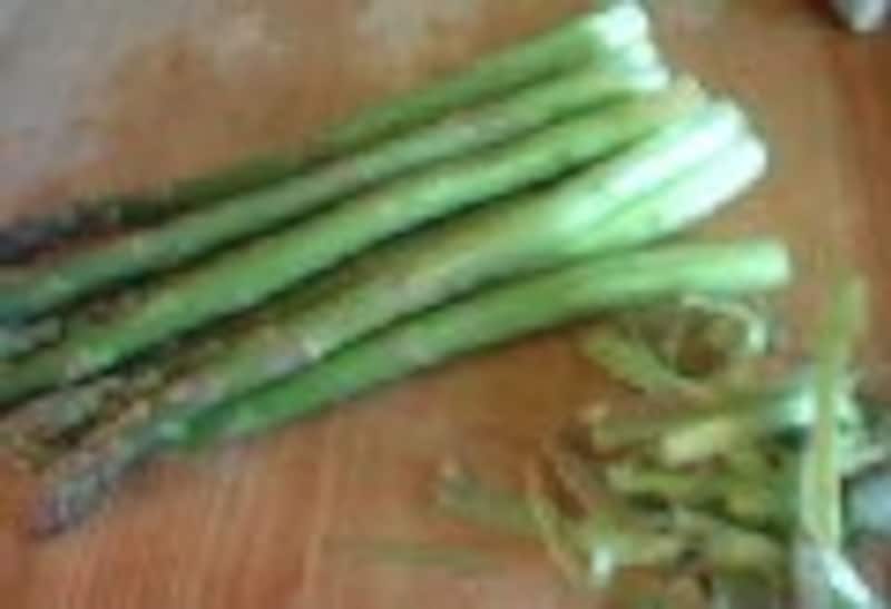 茹でたアスパラとベーコンを、時計の針の10時ぐらいの位置におき、巻いてゆきます。手前から斜めに、ひきながら巻くようにすると、しっかりと巻けます。