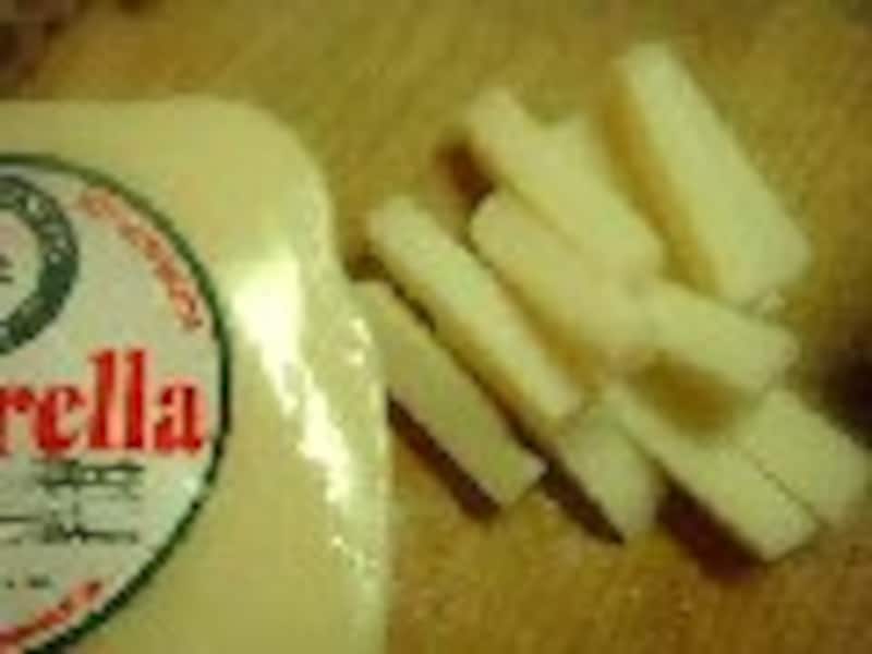 モッツアレラは、ワンタンの皮の一方の長さの半分を目安に切ります。
