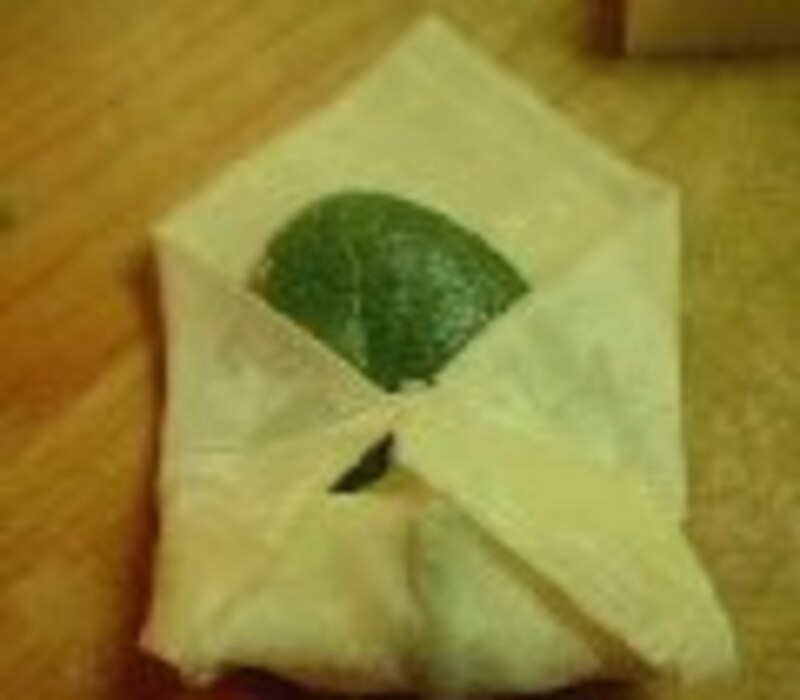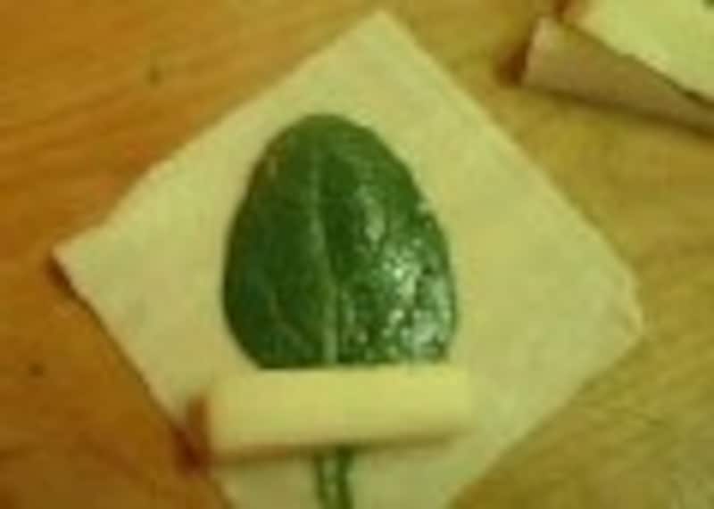 ワンタンの皮をダイヤモンド型に置き、バジルの葉を1枚。手前にチーズを置き、まず1回巻きます。