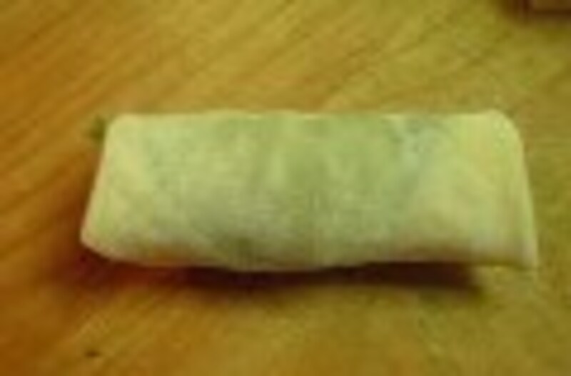 1回巻いたら、両側を内側に折りたたみます。このとき、チーズが出ないようにしっかりと両側を閉じます。(すき間があると、揚げている時に溶けたチーズが流れ出てしまいます)