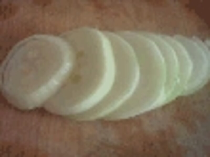 たまねぎの皮をむき、1~1.5cmぐらいの厚さの輪切りにします。クッキングペーパーなどで軽く水気をおさえると、衣のつきがよくなります。