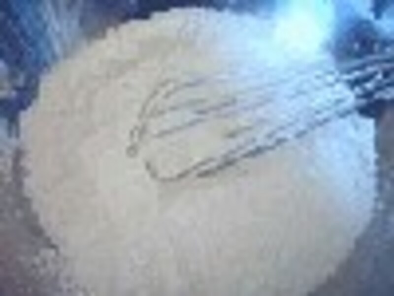 粉類と塩・グラニュー糖を1つのボールにあわせて、泡立て器でよくかき混ぜておきます。(これをAとします)