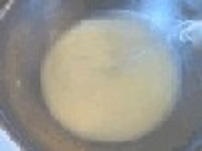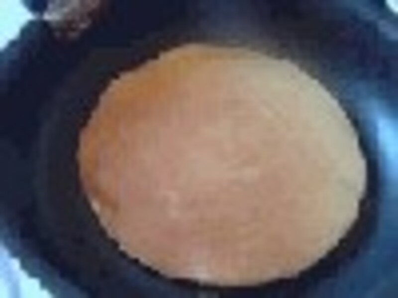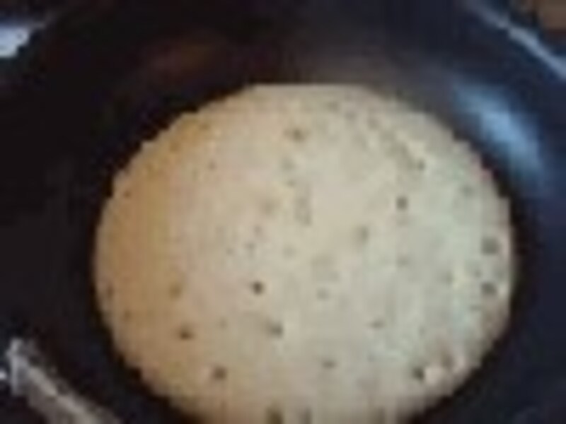 そこへ、お玉などで生地を流し込みます。弱火のまま、表面に泡がポツポツ出てきたらひっくり返します。
