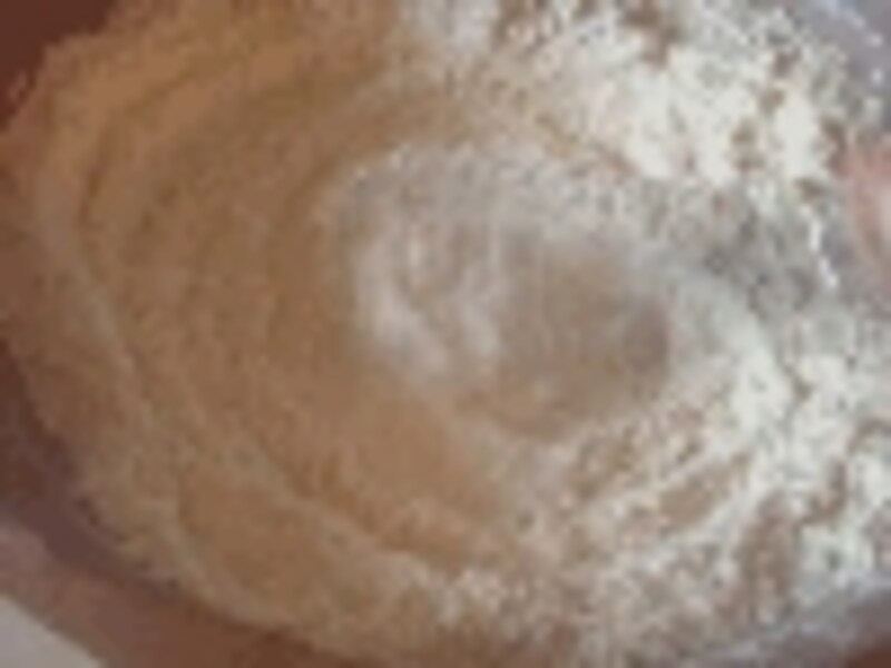 小麦粉・ベーキングパウダー・塩を大きいボールに入れ、泡立て器でよくかき混ぜます。(面倒でない方はふるって下さい)