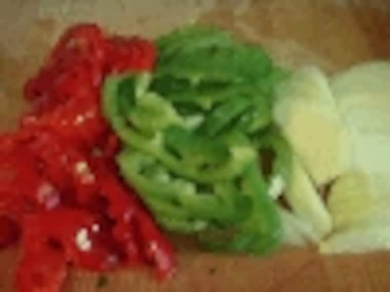 むね肉をラップで挟んで軽くたたき、厚みを均等にします。ボールにお肉を移し、塩2つまみ・ライムの果汁・にんにくとたまねぎのすりおろし・シナモンと一緒にもみこんで、タッパ-や密封ビニール袋などに入れて、30分以上冷蔵庫で寝かせます。玉ねぎ・ピーマンを、1cm弱の幅で細切りにします。また、マリネしておいた鶏肉も1.5cmほどのそぎ切りにします。炒めようのにんにく1かけはみじん切りに。