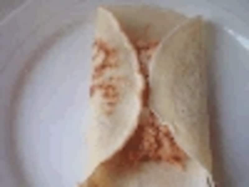 トルティーヤの中心に、先ほど作ったツナライスをのせ、具を包むように両端をたたみます。それから上下を更にたたみ、四角形にします。閉じ終わりは、水溶き小麦粉でつけるか、うまく閉じないようでしたら爪楊枝などでとめてください。