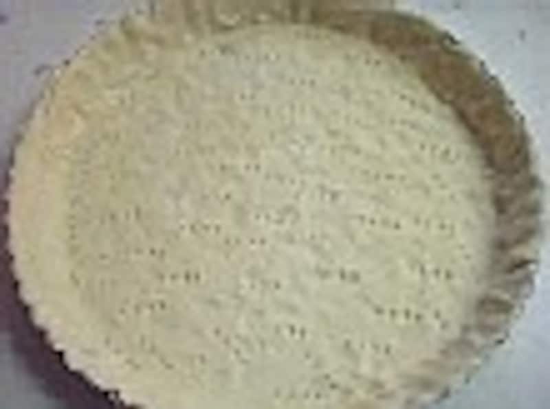 やわらかくなったパイシートを全体の厚みが均等になるようにのばし、パイ皿に敷きます。敷いたらフォークなどでまんべんなく小さな穴を開けておきます。
