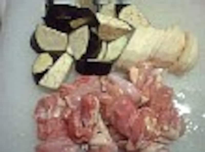 鶏むね肉(皮付きで約400g)、なす(大2本)、れんこん(小1コ)、緑の野菜(いんげんやアスパラなど:適宜)、片栗粉、揚げ用油