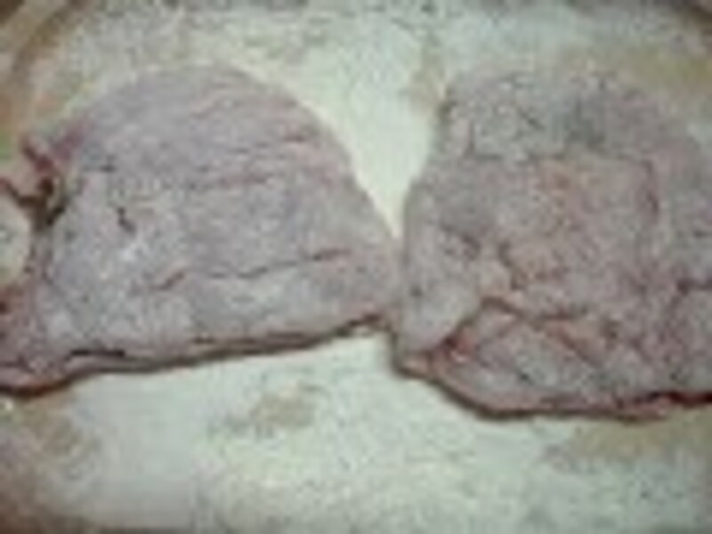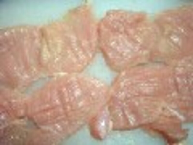 ・中までまんべんなく火を通すために、お肉は均一の厚みになるようよくたたいてください。