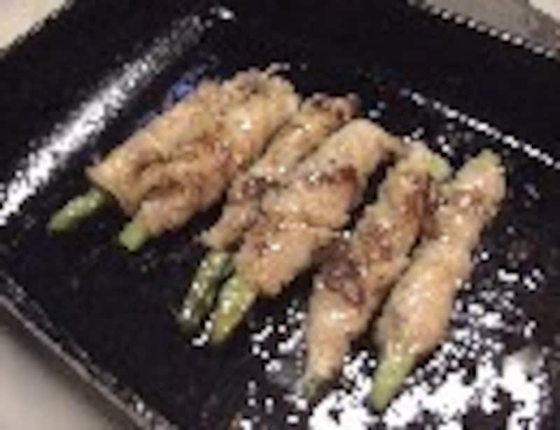 【 材 料 】豚薄切り肉(ロースやばら肉など:2枚)、 ショートアスパラ(4本) 塩、こしょう、サラダ油 【 作 り 方 】 アスパラは塩ゆでし、粗熱をとり水気をふきとっておきます。豚肉は半分に切ります。アスパラ1本を豚肉半分で巻いてゆきます。フライパンに油を熱し、巻き終わりを下にして焼きます。焼き色がつき、巻き終わりがしっかりくっついたらひっくり返し、前面に焼き色がつきお肉に火がしっかり通ったら、仕上げに軽く塩こしょうを振ります。【ポイント】 薄切りのお肉なら、牛・豚を問わず代用できます。一緒に巻くお野菜も、きのこ類やゆでたオクラ、にんじん、じゃがいもなど、冷蔵庫にあるもので。 |