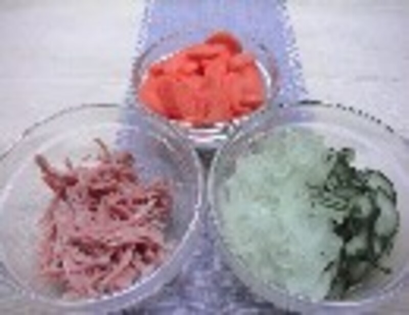 皮付きのじゃがいも、卵はそれぞれ中までしっかり火が通るまでゆでます。玉ねぎは薄切りにして水にさらし、きゅうりは種をとって半月切りにして塩もみし、どちらも水気をよく切ります。