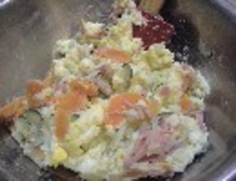 【 材 料 】ボローニャソーセージ(薄切り2枚)、 男爵いも(小:2コ)、卵(1コ) きゅうり(1/4本)、にんじん(1/3本) 玉ねぎ(1/4コ)、マーガリン(適量) サンドイッチ用薄切りライ麦パン(6枚) ・あわせ調味料 マヨネーズ(大さじ2)、マスタード(小さじ1/4)、白ワインビネガー(大さじ1/2)、砂糖(小さじ1/3)塩(小さじ1/4)、こしょう 【 作 り 方 】 皮付きのじゃがいも、卵はそれぞれ中までしっかり火が通るまでゆでます。玉ねぎは薄切りにして水にさらし、きゅうりは種をとって半月切りにして塩もみし、どちらも水気をよく切ります。にんじんは半月切りにし、塩茹でして粗熱をとっておきます。薄切りソーセージは千切りにします。 中まで十分に火が通ったらジャガイモをざるに上げ、温かいうちに皮をむきます。卵も同様に殻をむき、ジャガイモといっしょによくつぶします。温かいうちに上記の調味料を加えよく混ぜたら、用意しておいた他の具材も加えてよく混ぜあわせます。これをマーガリンを薄く塗ったパンにはさみ30分ほど冷やして完成。 【ポイント】 じゃがいもが温かいうちに調味料を混ぜ合わせると味がよくなじみます じゃがいもの皮をむくときは、やけどに気をつけてください