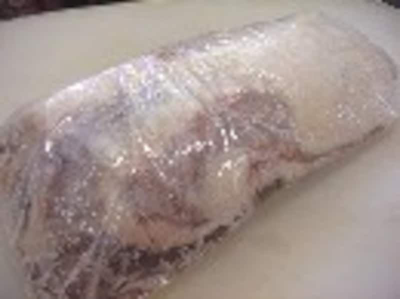 豚肉は背脂の部分に浅く包丁を入れ、豚肉全体に塩を振ってラップにくるみ、半日ほど冷蔵庫で寝かせます。