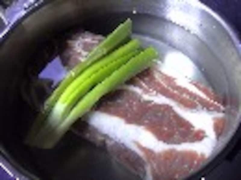 寝かせた豚肉を取り出し、水洗いします。大きなお鍋に水(お肉に対しひたひたになるぐらい)と酒、長ネギとしょうがを加え、豚肉をゆでてゆきます。最初は強火で、沸騰したら火を弱め1時間ほど煮ます。途中お湯が少なくなるようなら、足し湯をします。ゆで終わったら豚肉を取り出し、黒こしょうをまんべんなく振って、冷まします。