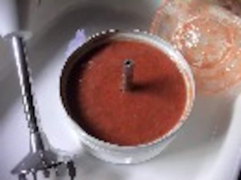 さいの目切りにしたトマト、みじん切りのパセリ、オリーブ油、バルサミコ酢をハンディプロセッサーや泡だて器などでよく混ぜ合わせてヴィネグレットソースを作ります。