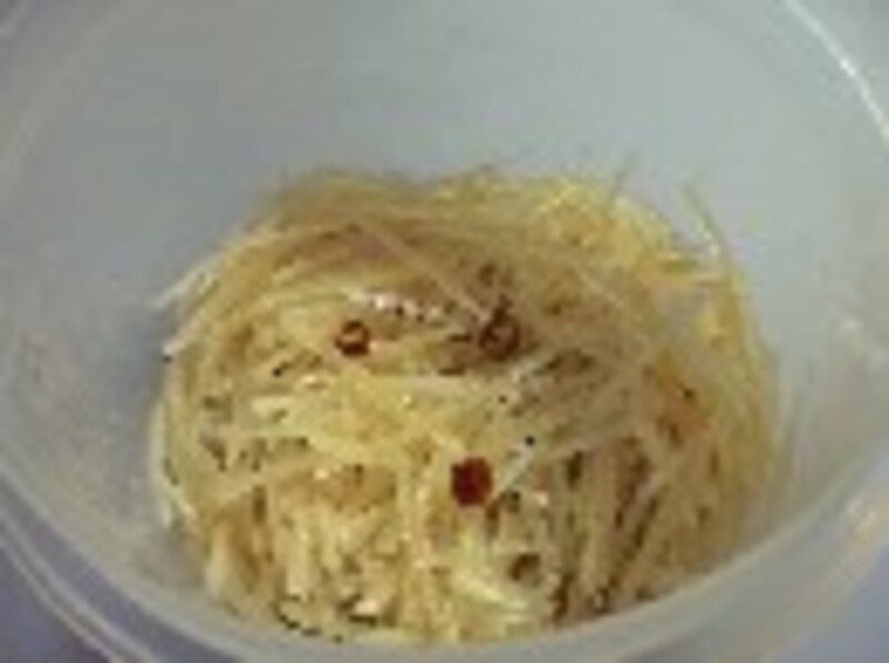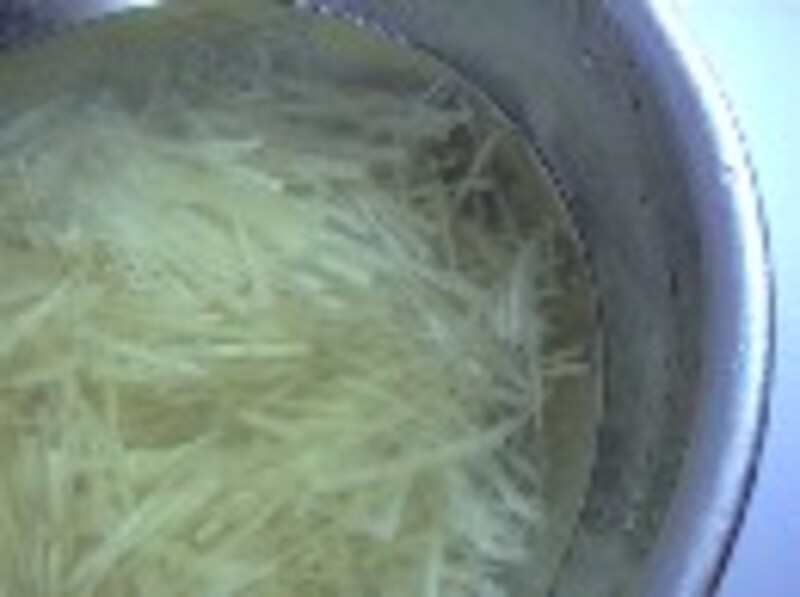 ヤーコンは細切りにして酢水にさらした後、水けをよく切っておきます。