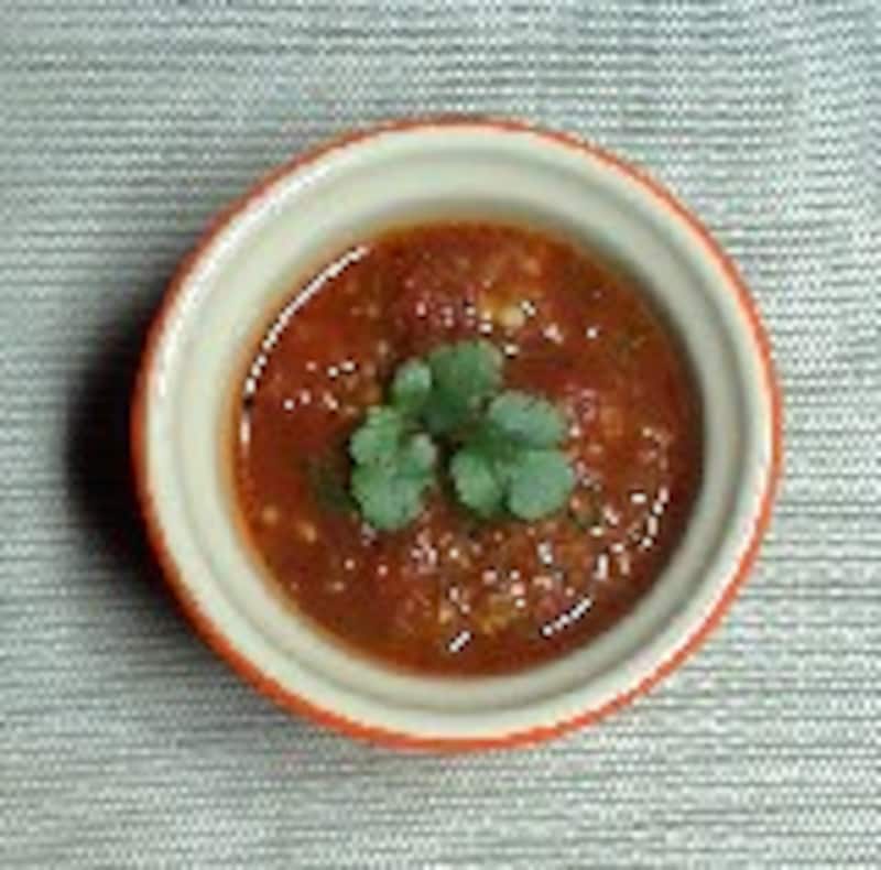 その間に玉ねぎと青唐辛子をみじん切りにし、冷めたトマトに加え、ライムと塩で味を整えます。お好みでコリアンダーの粗みじん切りを加えます。