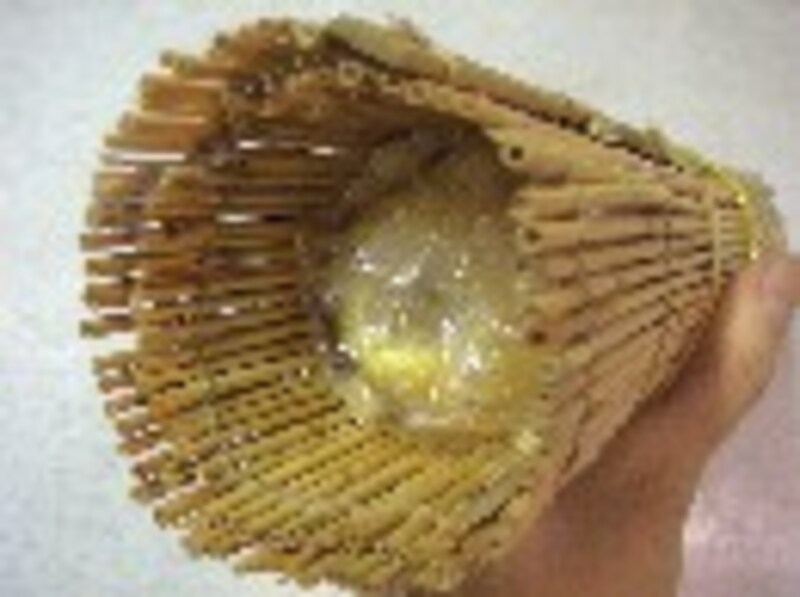 市販されている伊達巻は、「鬼簾」という目の粗い巻きすを使います。 生地を巻くときに、巻きすの上にラップを敷き、その上に生地をのせてしっかりと巻き、巻きすとラップの間に4本等間隔で菜ばしをかませておくと、切り口が花形に仕上がります。 |
