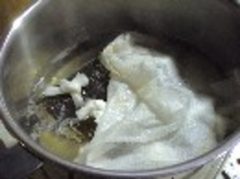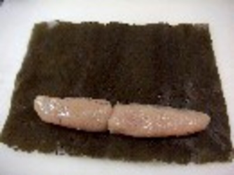 たらこを昆布に巻くときは、繊維に逆らうようにして巻きます。繊維に沿って巻くと、煮ているうちに昆布が膨らんでしまいます。