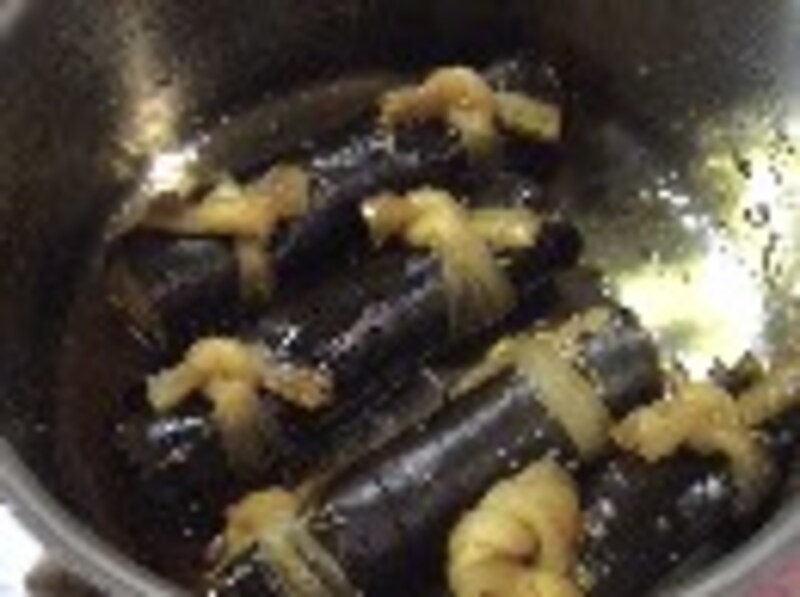 ※昆布を半分に切ってたらこを1腹ずつ巻いても、1度に2腹巻いてもどちらでもいいです。煮るお鍋の大きさによって調節してください。