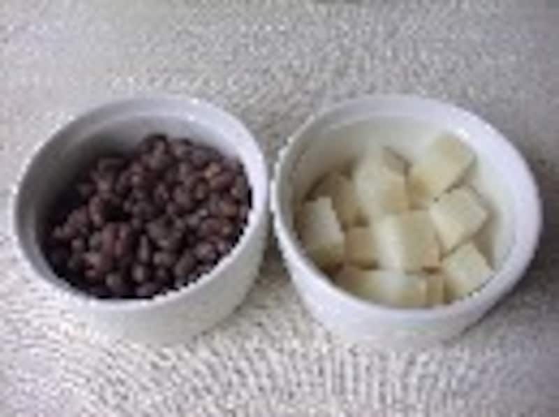 お餅は、8等分のさいの目切りにします。 その後、小豆と餅を加え、お餅が柔らかくなったら完成です。