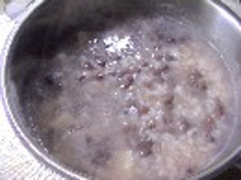 【ゆで小豆】小豆(50g)、水(3カップ) 【おかゆ】 米(180cc:1カップ)、水(800cc)、小豆のゆで汁(約50cc強)、塩(小さじ1/2) その他… お餅(2切れ)