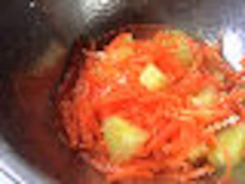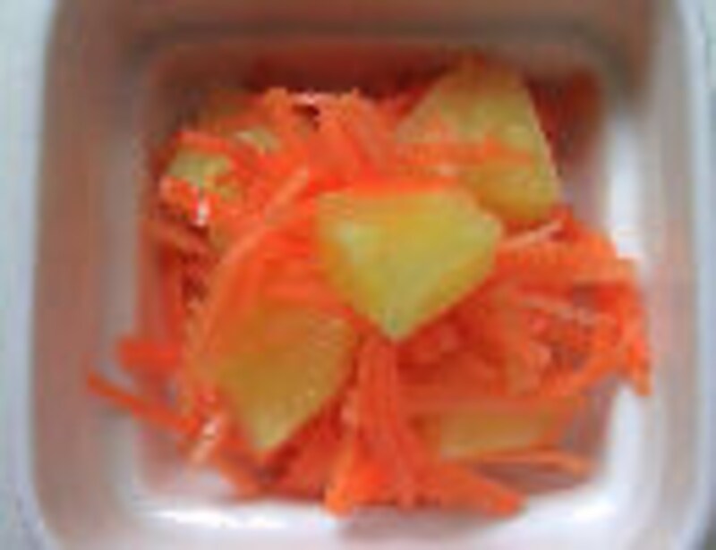 にんじんは千切りにし、塩を加えて軽くもみ水気を絞る。パイナップルは食べやすい大きさに切り、にんじんと混ぜる。シロップとお酢、こしょうでにんじんとパインを和えて、15分ほど置いて味をなじませる。汁気を切ってお弁当に入れる。