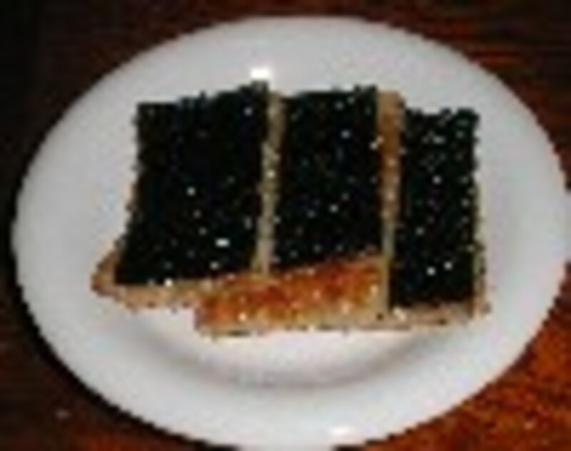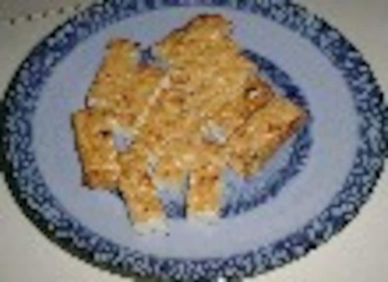 これに、はけで醤油を塗って海苔を貼り付けてサッと焼いて切れば、おこげの磯辺焼き。◆◆フライパンはよく熱してから焼く事と、切る前にペーパータオルの上で 油を切る事が油っぽくないおこげを作るコツ。