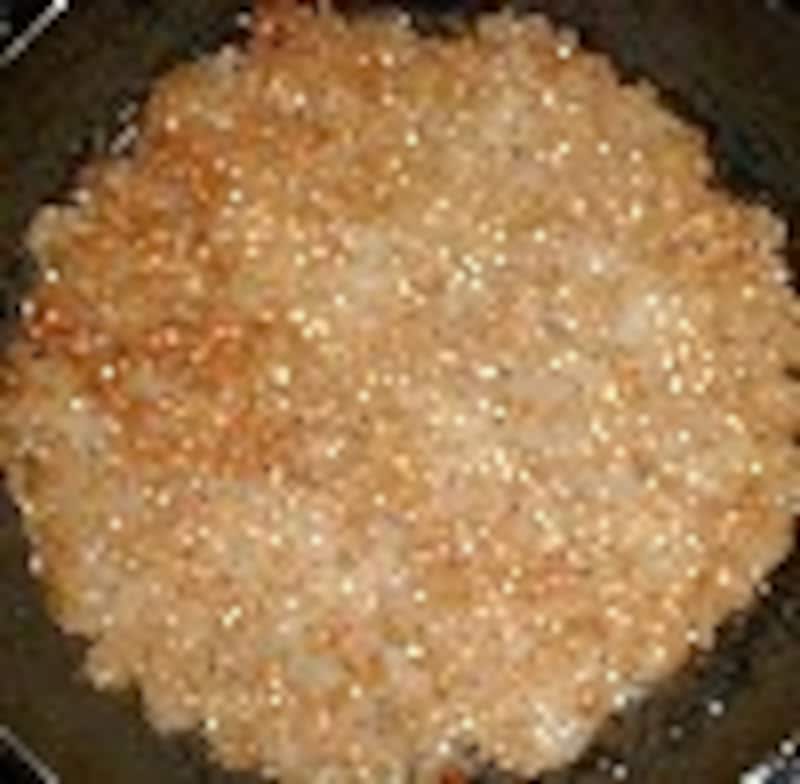 片栗粉大さじ1を同量の水で溶いたものを加え、混ぜる。フライパンに油大さじ1.5を熱しご飯を平らにして両面こんがり焼く。