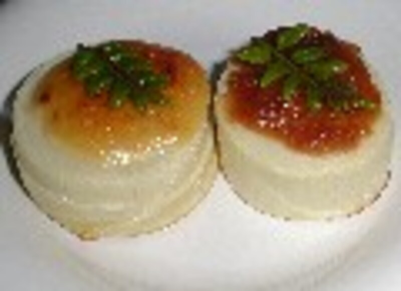 茹でた竹の子を輪切りにする。甘味噌を塗ったものと、マヨネーズ辛子みそ(味噌とマヨネーズ同量に、練り辛子を混ぜる)を塗ったものをオーブントースターで焼き、木の芽を飾る。 |