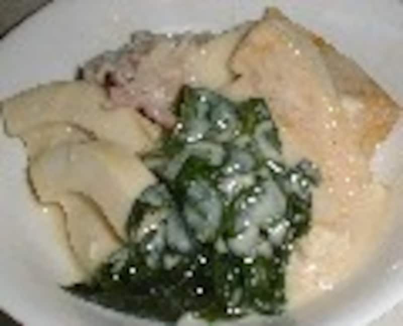 筍にヒタヒタの出し汁を入れ(400cc)、5分程煮て、砂糖小さじ1、みそ大さじ2、酒粕大さじ2を加えて溶かし、豚肉、油揚げを加えて煮込む。最後に若布を加え、しょう油小さじ1を加えて味を引き締め、火を止める。 |