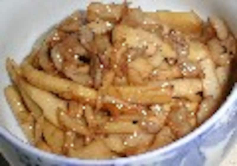 筍250gと豚肉70gを千切りにする。豚肉にしょう油小さじ1、酒小さじ1で下味をつける。ニンニクを叩いてつぶし、赤唐辛子と一緒にフライパンで炒める。豚肉を炒め、筍を加え、砂糖小さじ1、しょう油大さじ2、酢大さじ1を加え、炒めあわせる。 |