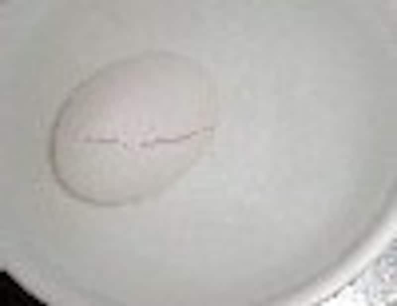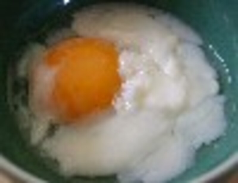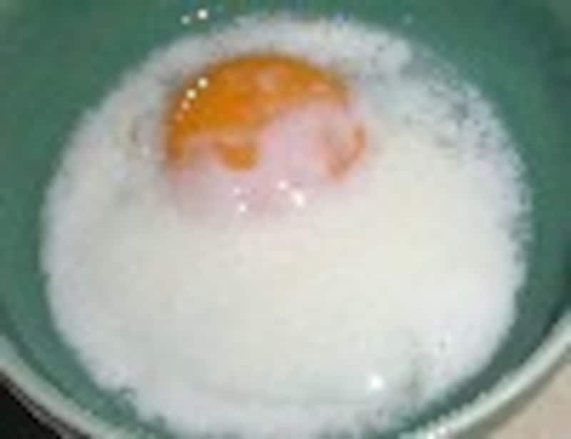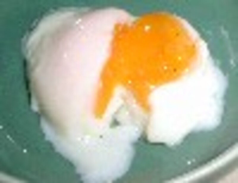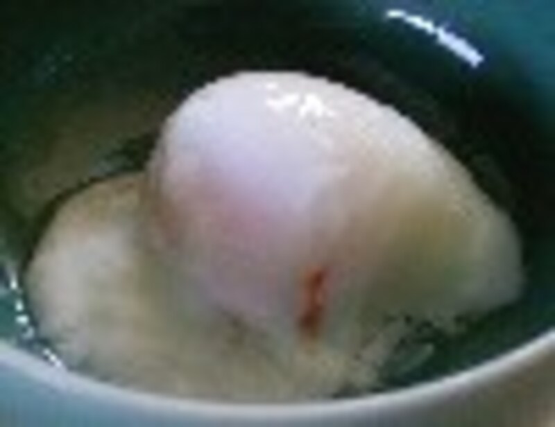 卵がかぶるほどの熱湯を注ぎ、20分後に水で冷まし割ったもの。白身がうっすら固まってる状態。 |