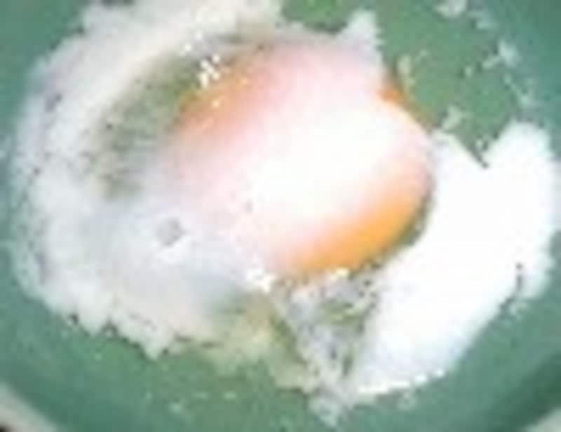 沸騰したお湯に酢を少し入れ、卵を割り入れ2~3分煮て、穴あきお玉ですくい上げたもの。温泉卵とは、また違った食感。 |