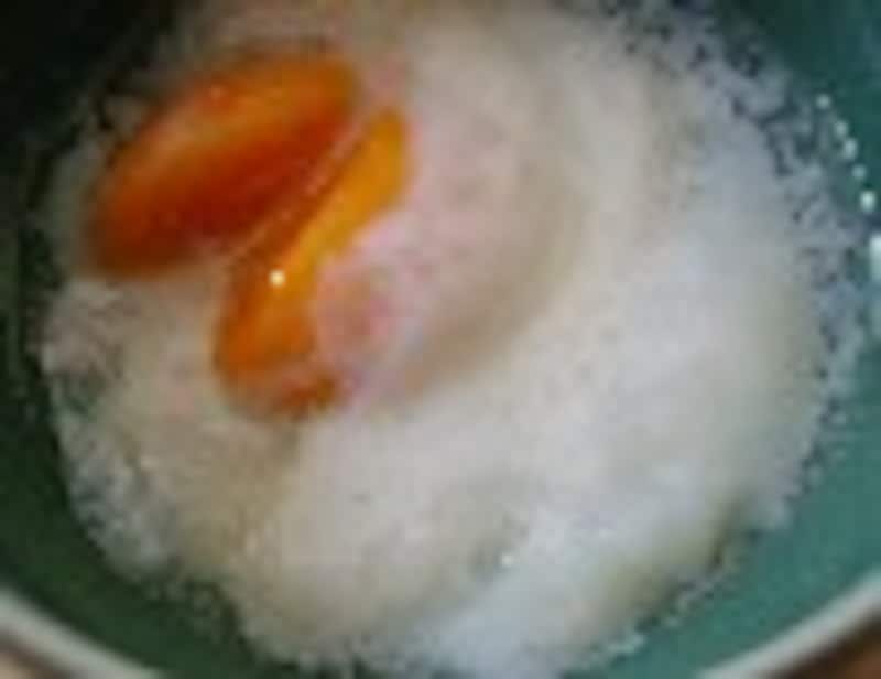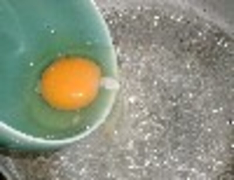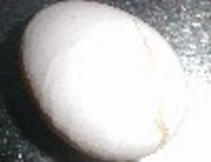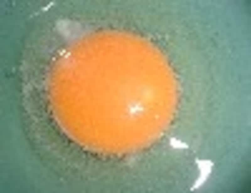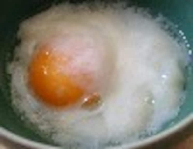一昼夜冷凍保存しておいた卵を使用。見た目は生卵。しかし、黄身が違う! 黄身が箸でちぎれる。 |
