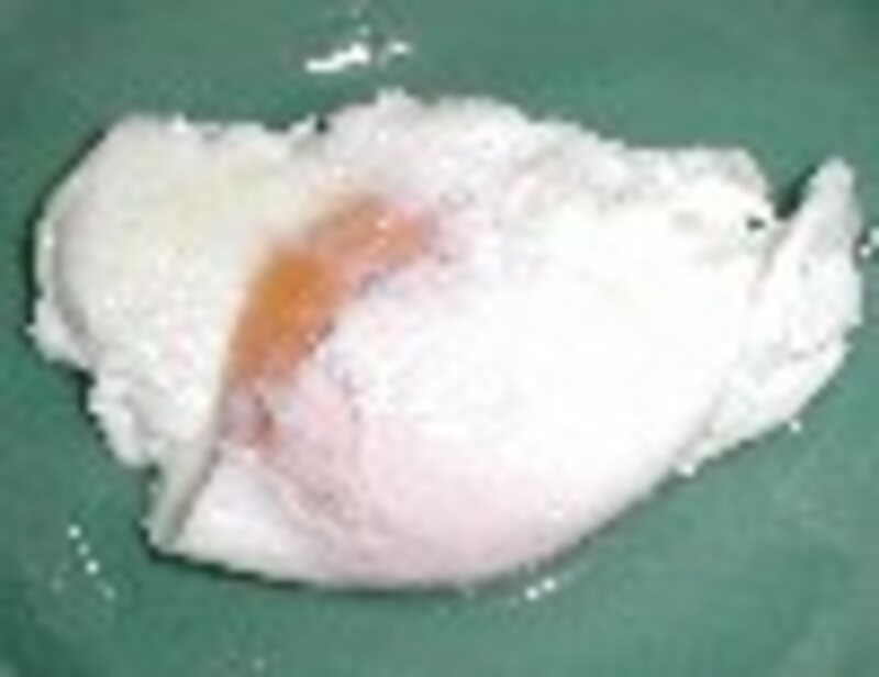 2.より白身が固まってる。殻に白身がくっついてるのでスプーンでかき出す。普通の半熟卵の作り方は、水に塩と卵を入れ火にかけ煮立ってから5分。 |