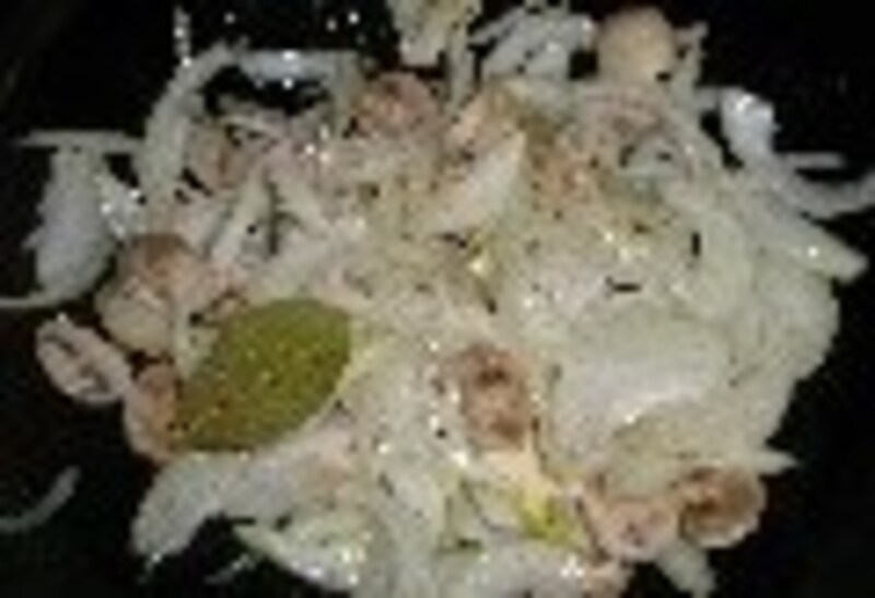 2.フライパンにバターを取り、玉ねぎ、マッシュルーム、エリンギ、ローリエをよく炒め、トマトを加え炒め、煮こみ鍋にあける。