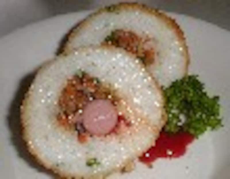 | 材料(8~10コ分) ・合びき肉100g・玉ねぎ半分・春雨少し・人参少々・椎茸2枚・ピーマン1コ・ゆで卵1コ・ケチャップ・小麦粉・生姜汁・砂糖・醤油・塩コショウ 作り方 具を作る▼ 1.春雨を硬めにもどし1cmに切る。 2.野菜をみじん切り。 3.挽肉、野菜、春雨の順に炒め、 小麦粉大さじ1をふり入れ炒め、生姜汁、塩コショウ、醤油、砂糖、トマトケチャップで味付け、 フォークでつぶしたゆで卵を加え、バットにあけ冷ましておく。 マッシュポテト▼ 1.じゃが芋6コの皮を剥いて、厚さを半分に切り、水から茹でる。2.柔らかくなったら湯を捨て、火にかけ水分を蒸発させ、鍋をゆすり粉吹き芋にし、潰す。 3.塩コショウして丸め、中に具を包み込み、小麦粉、卵液、パン粉をつける。 4.約180℃のたっぷりの油でカラリと揚げる。(コロッケが油から顔を出してると皮が破れる) ●付け合せは山ウドのマリネ ![]() バターライスに具とチーズとウインナーを入れ、衣をつけて揚げたライスコロッケ 【関連ページ】 【山菜のマリネ】